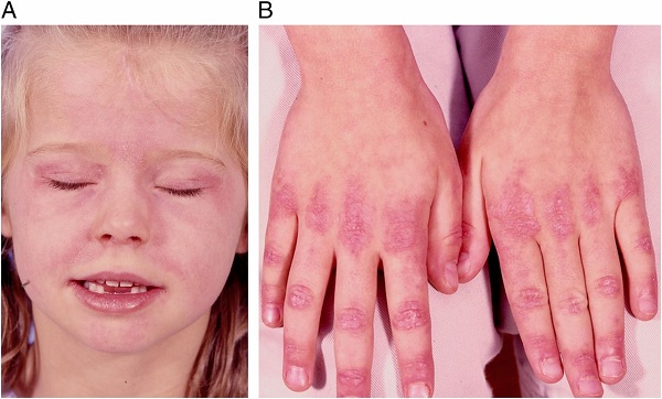 Phát ban: Các mảng màu đỏ hoặc nâu đỏ có thể xuất hiện trên các đốt ngón tay.