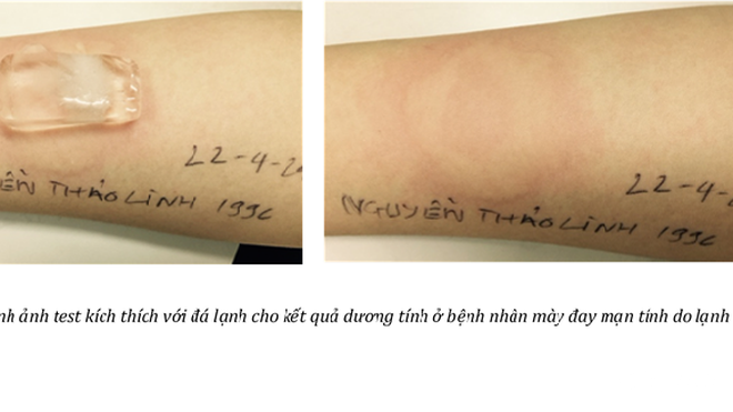 Bệnh nhân đến khám tại Trung tâm Dị ứng – MDLS BV Bạch Mai sau khi khai thác tiền sử, khám chúng tôi nghi ngờ bệnh nhân mày đay mạn do lạnh, bệnh nhân được chỉ định các xét nghiệm máu cơ bản đánh giá tình trạng dị ứng và các bệnh phối hợp khác, ngoài ra bệnh nhân cũng được thực hiện test kích thích với đá lạnh, xét nghiệm kích thích với đá lạnh cho kết quả dương tính sau 15 phút (hình ảnh).
